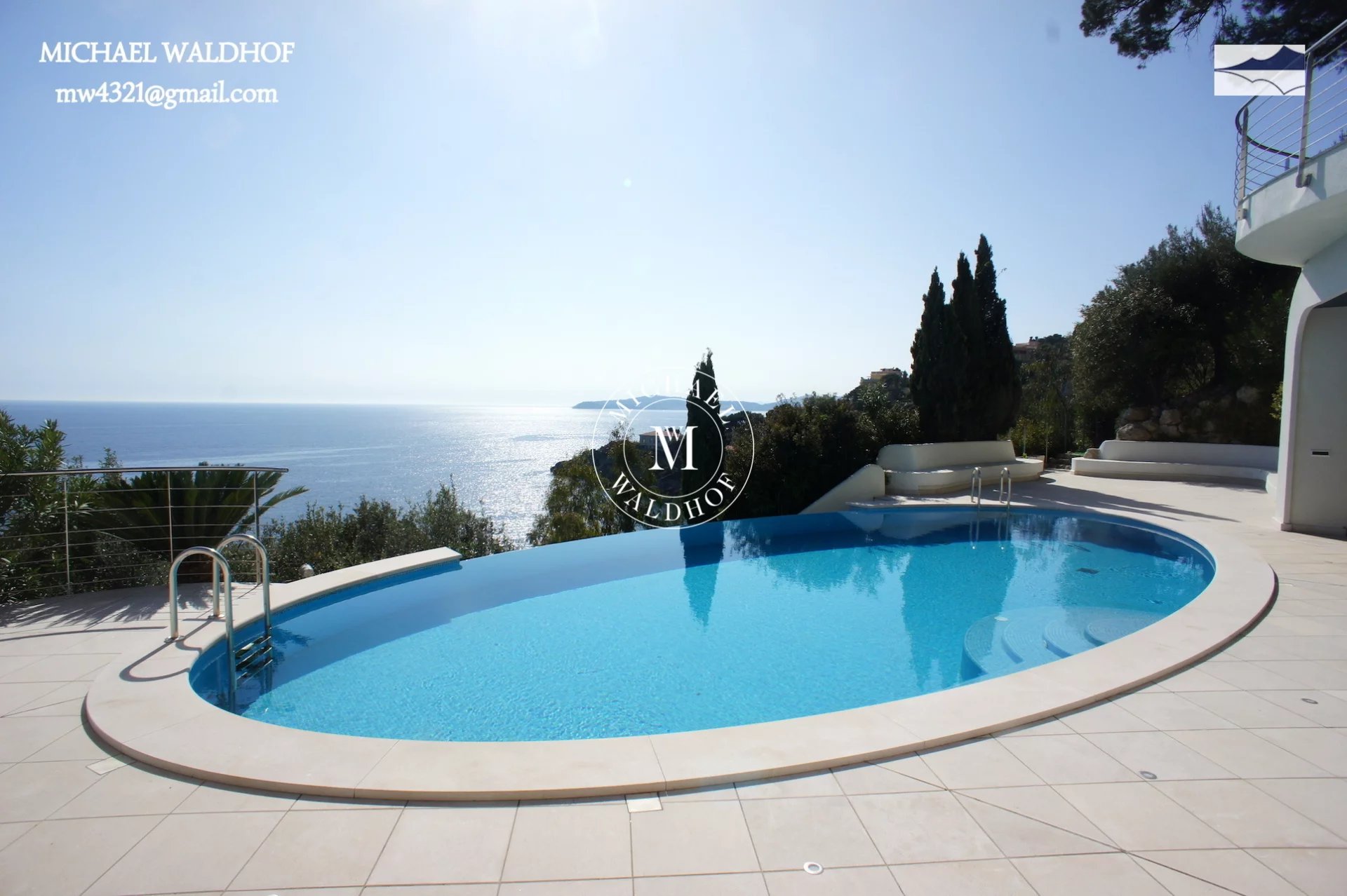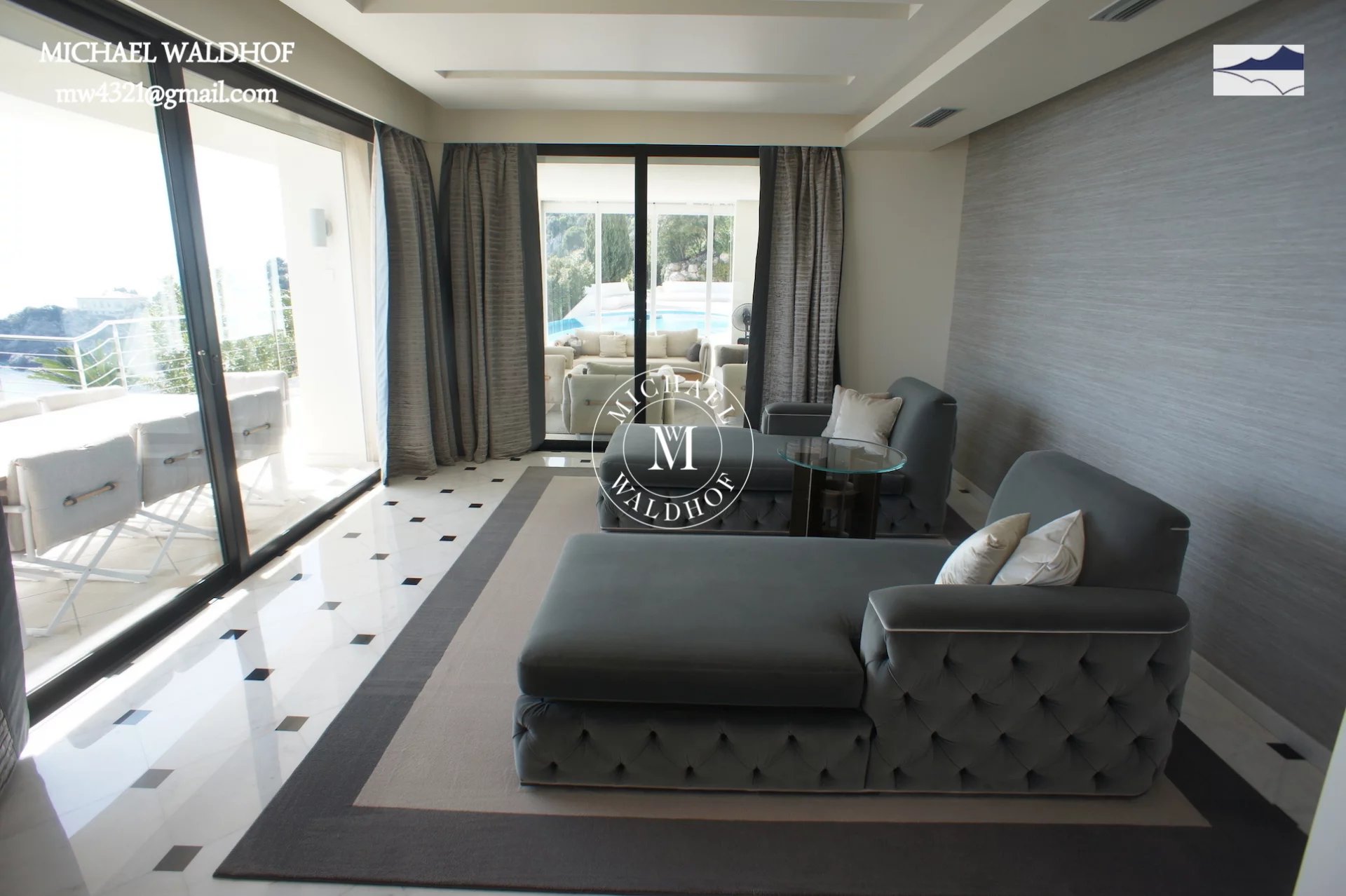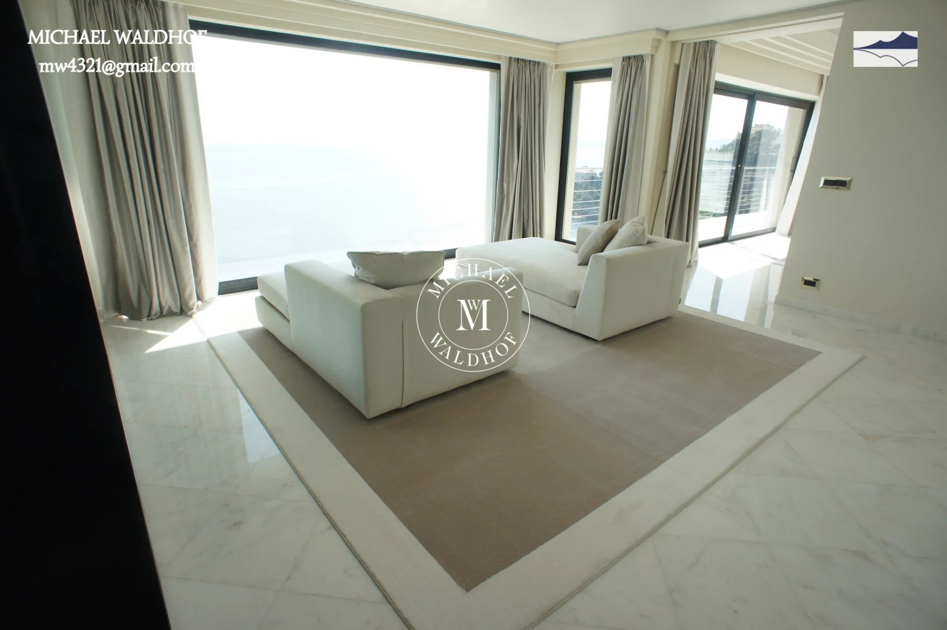 Monaco - Cap d Ail villa moderne aux lignes épurées, salon de 100 m² avec mobilier moderne et vue panoramique, 5 chambres avec vue sur la mer, cuisine équipée ultramoderne, appartement séparé pour le personnel de maison, piscine avec vue sur la mer, garage pour 2 voitures, la mer à 300 mètres est accessible à pied en 2 minutes, à 5 minutes en voiture de la vie trépidante de la Principauté de Monaco.