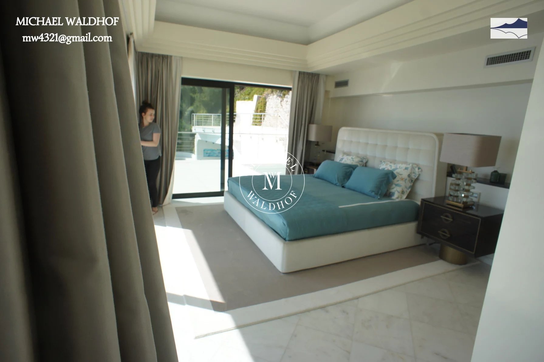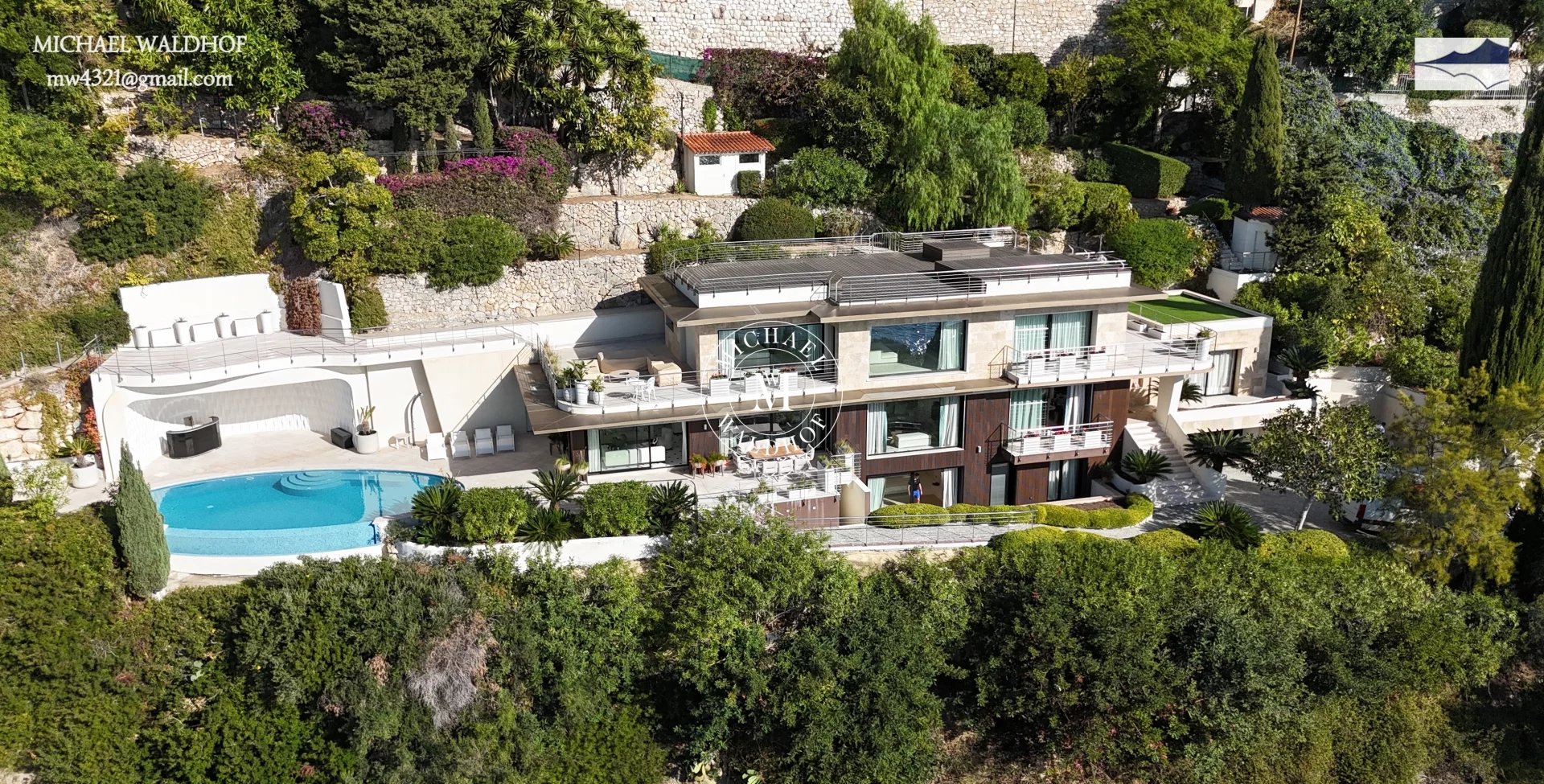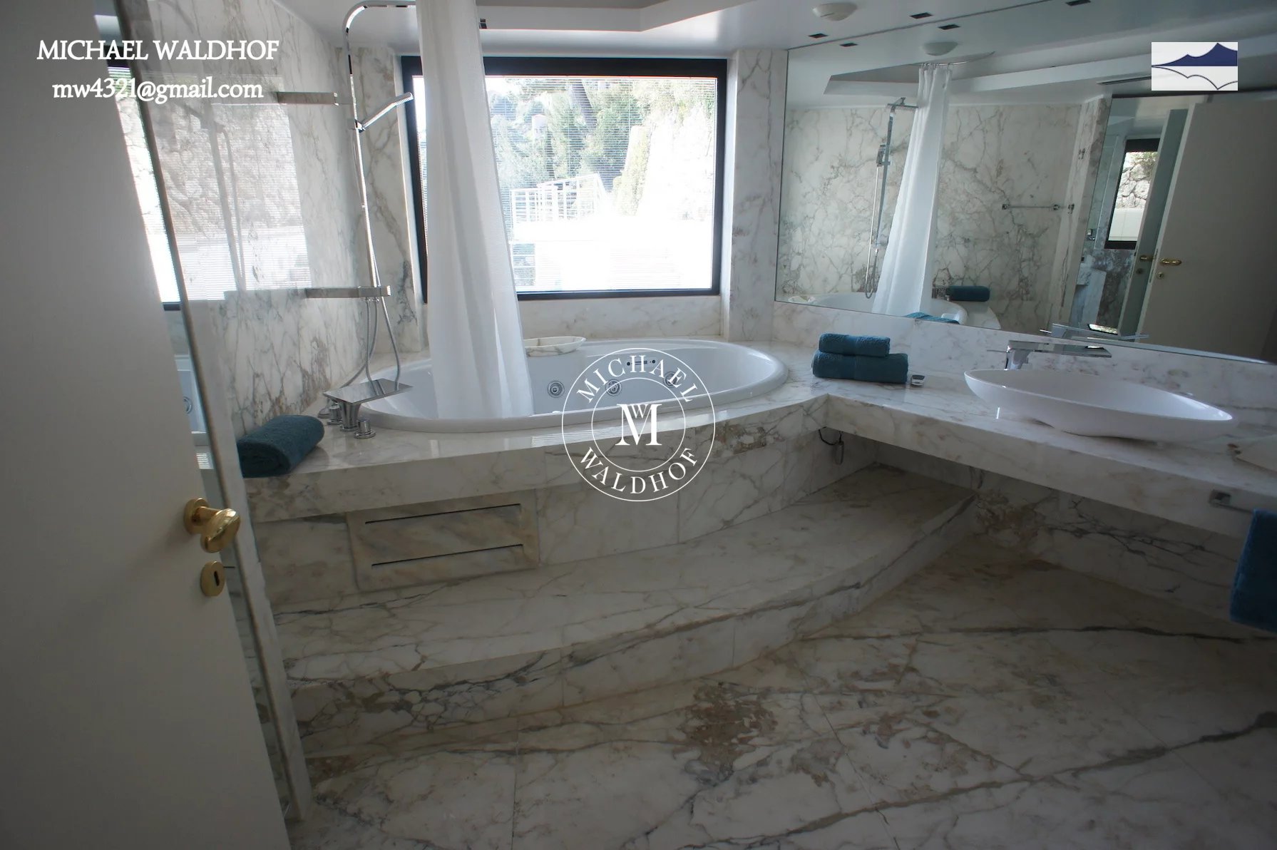 Monaco - Cap d Ail villa moderne aux lignes épurées, salon de 100 m² avec mobilier moderne et vue panoramique, 5 chambres avec vue sur la mer, cuisine équipée ultramoderne, appartement séparé pour le personnel de maison, piscine avec vue sur la mer, garage pour 2 voitures, la mer à 300 mètres est accessible à pied en 2 minutes, à 5 minutes en voiture de la vie trépidante de la Principauté de Monaco.